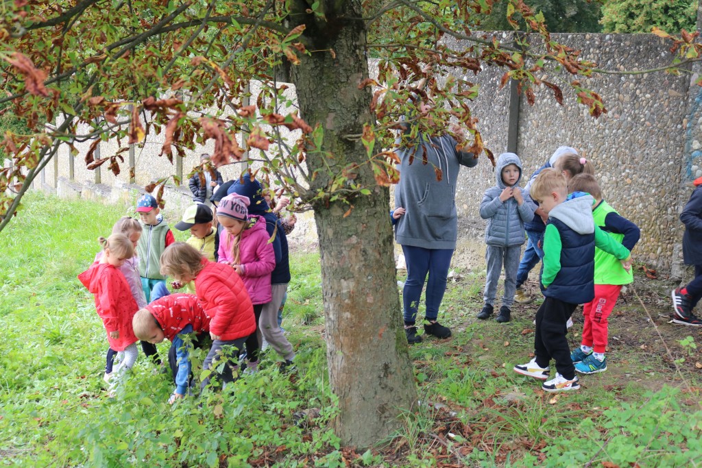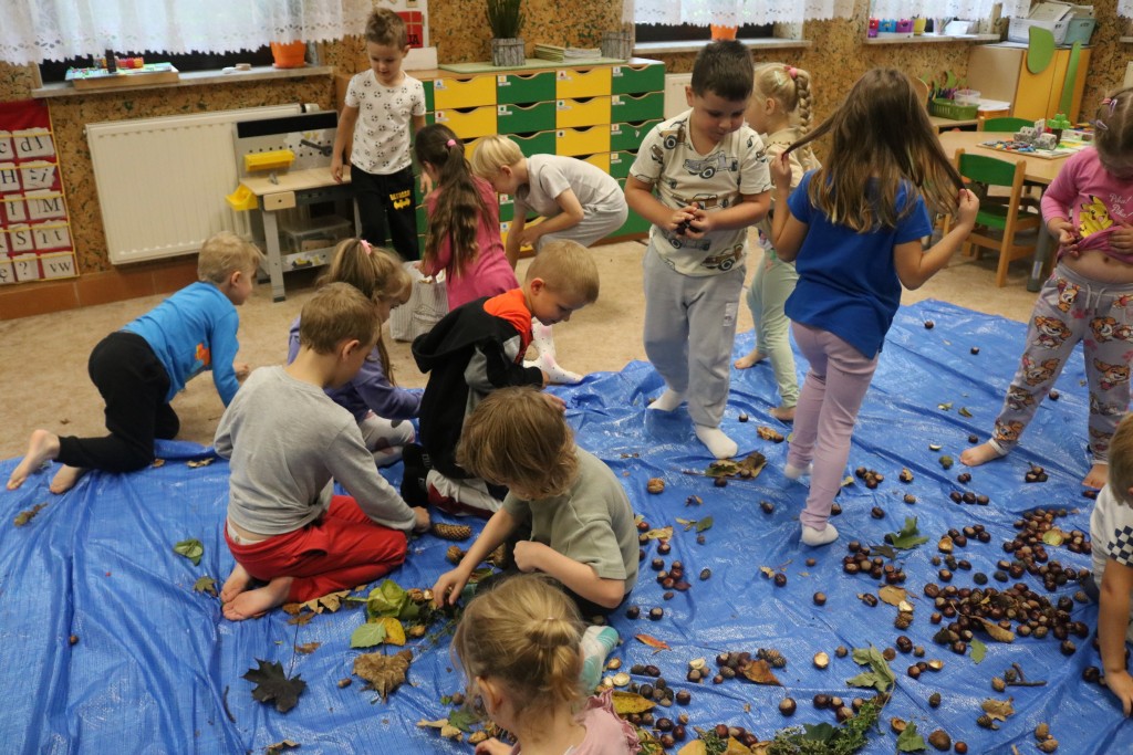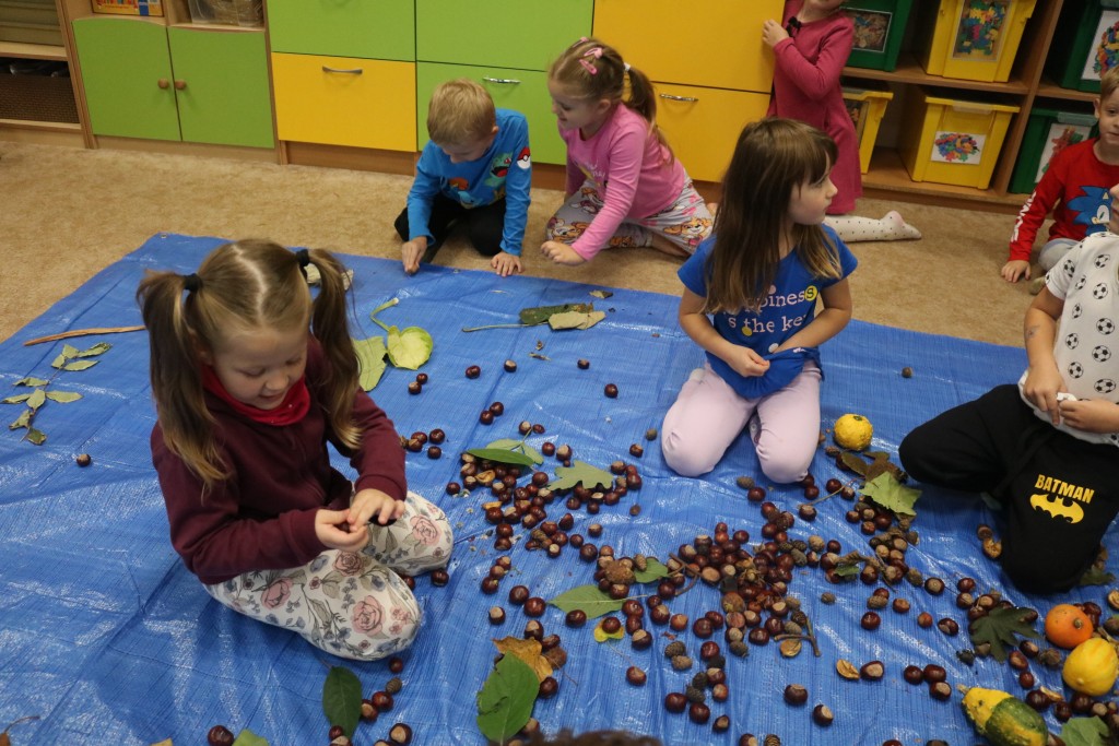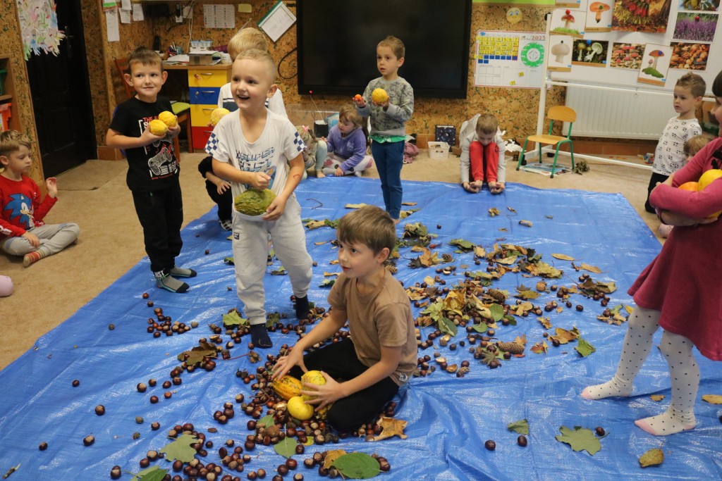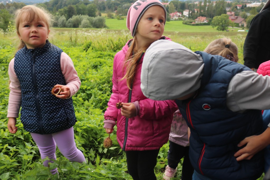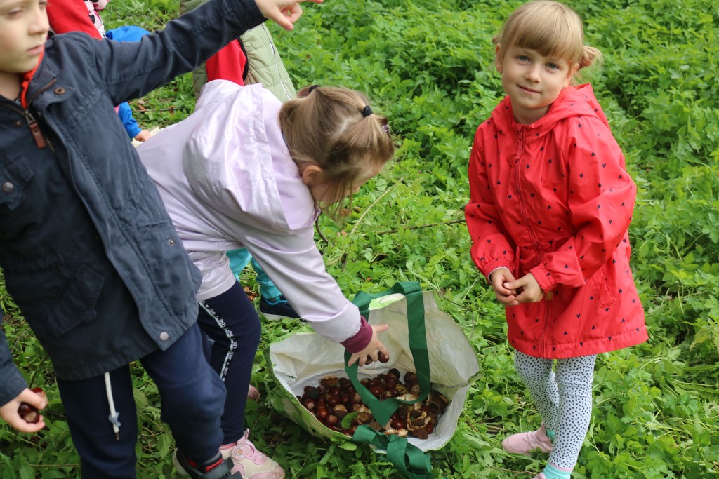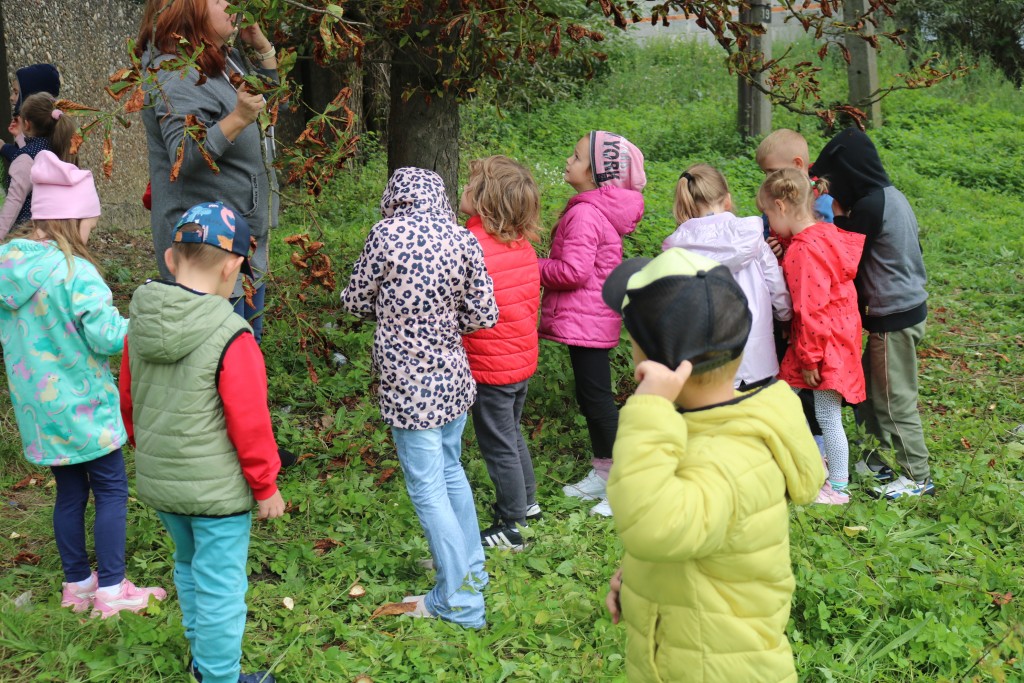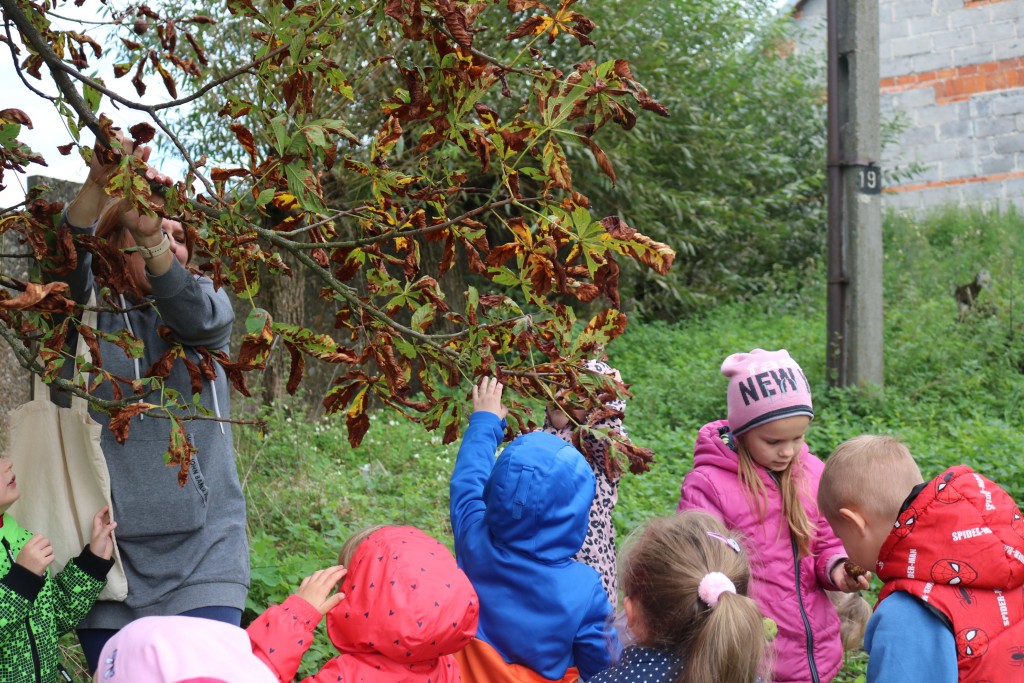 Nasze Przedszkolaki postanowiły udać się na spacer w celu poszukiwania oznak jesieni oraz zebrania jej darów w postaci liści i kasztanów.