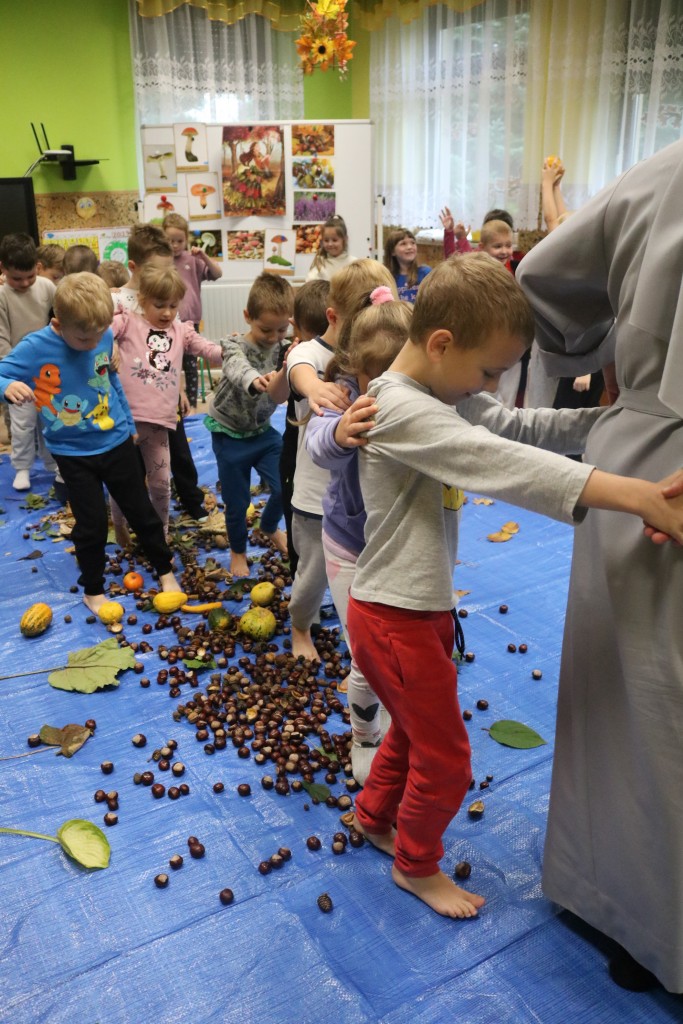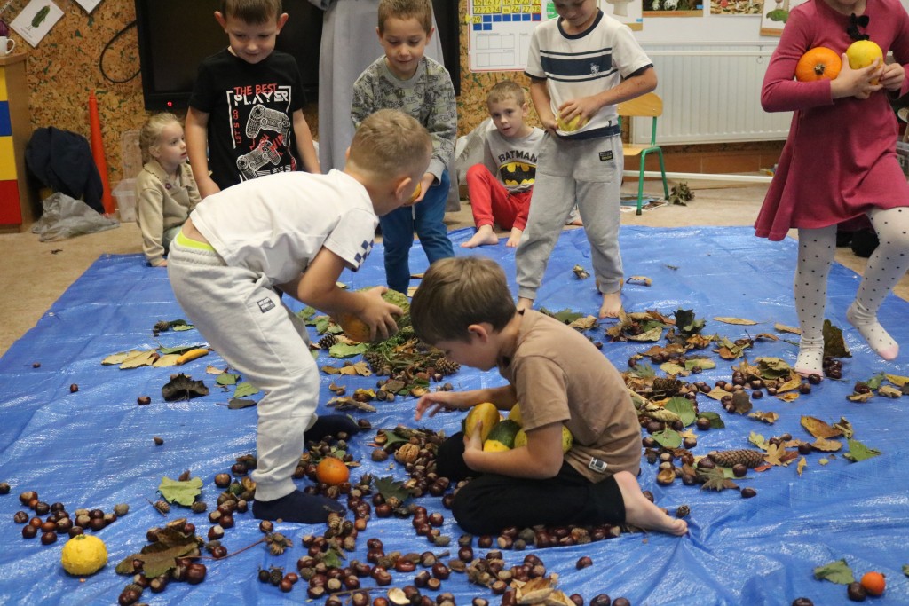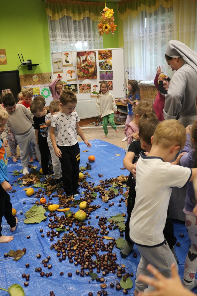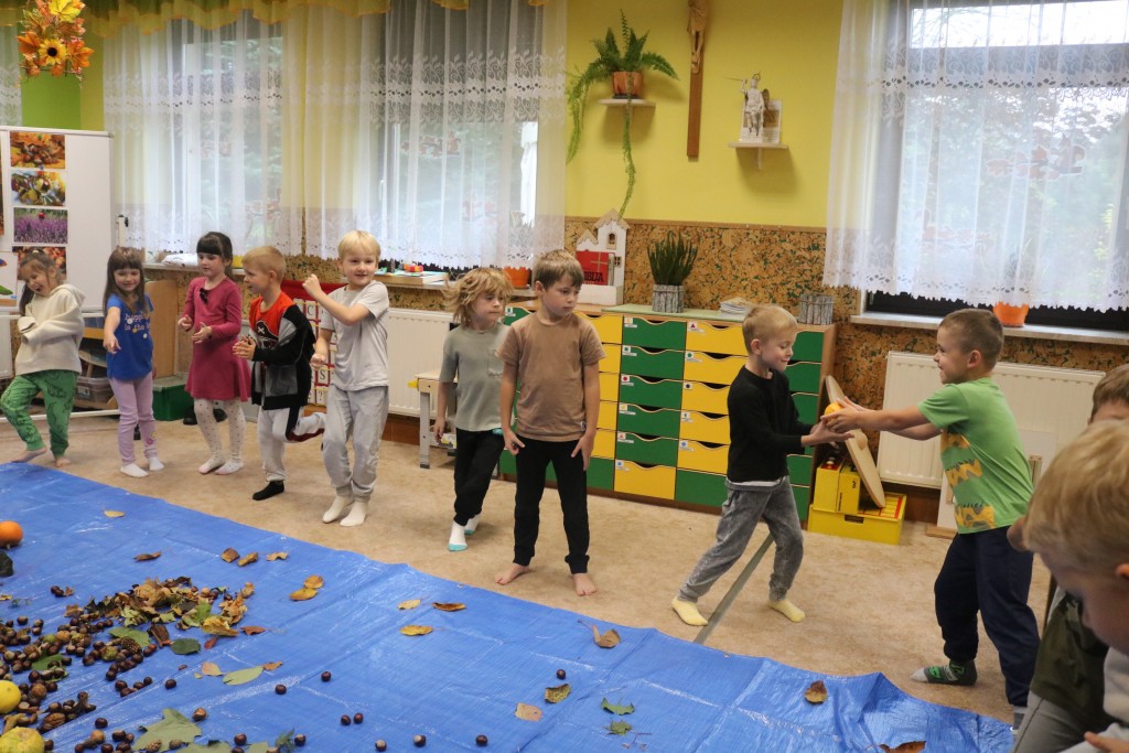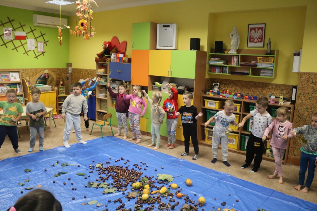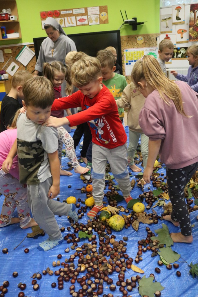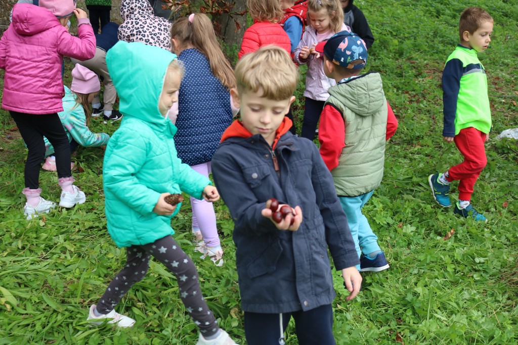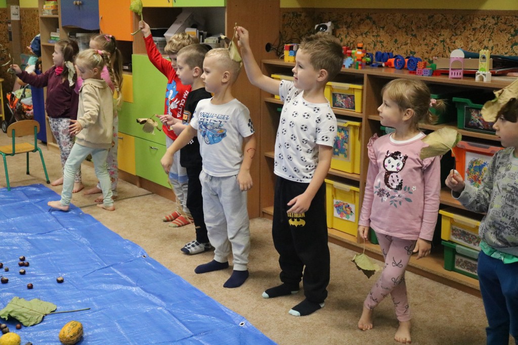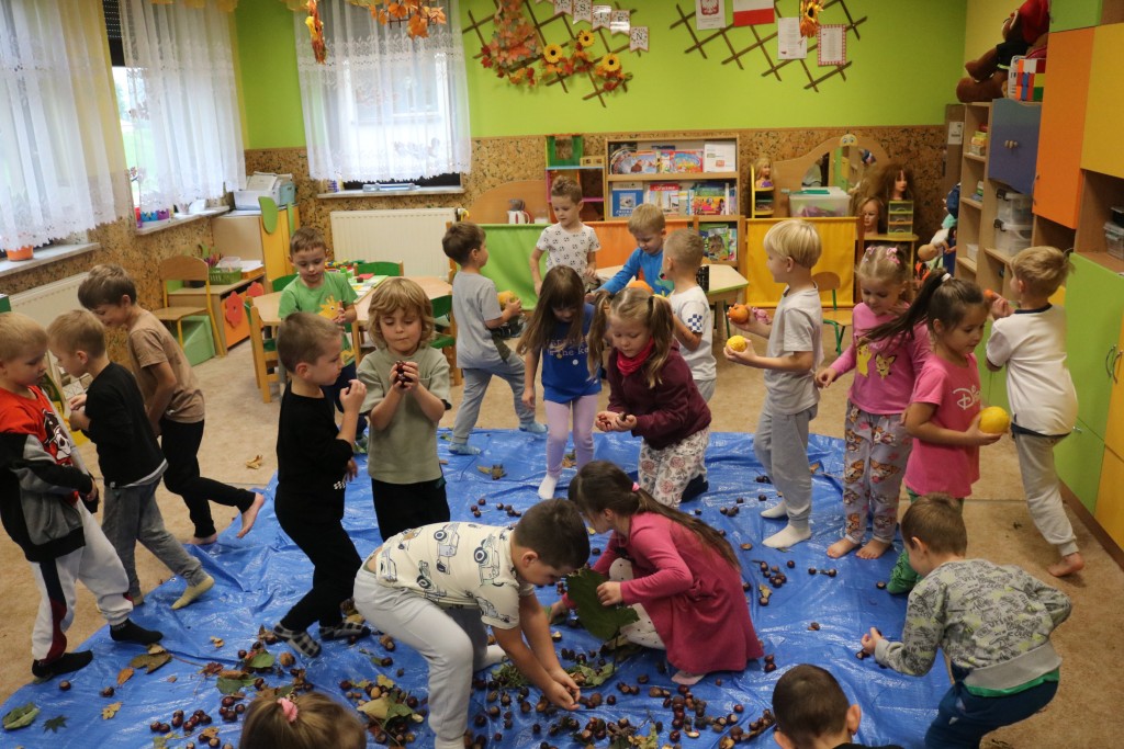 Nasze Przedszkolaki postanowiły udać się na spacer w celu poszukiwania oznak jesieni oraz zebrania jej darów w postaci liści i kasztanów.