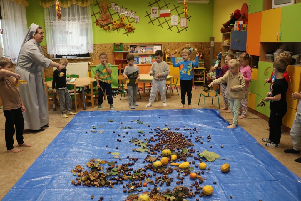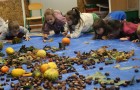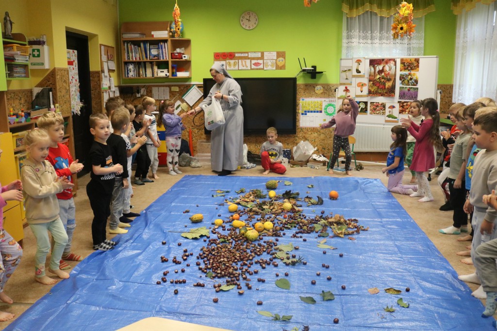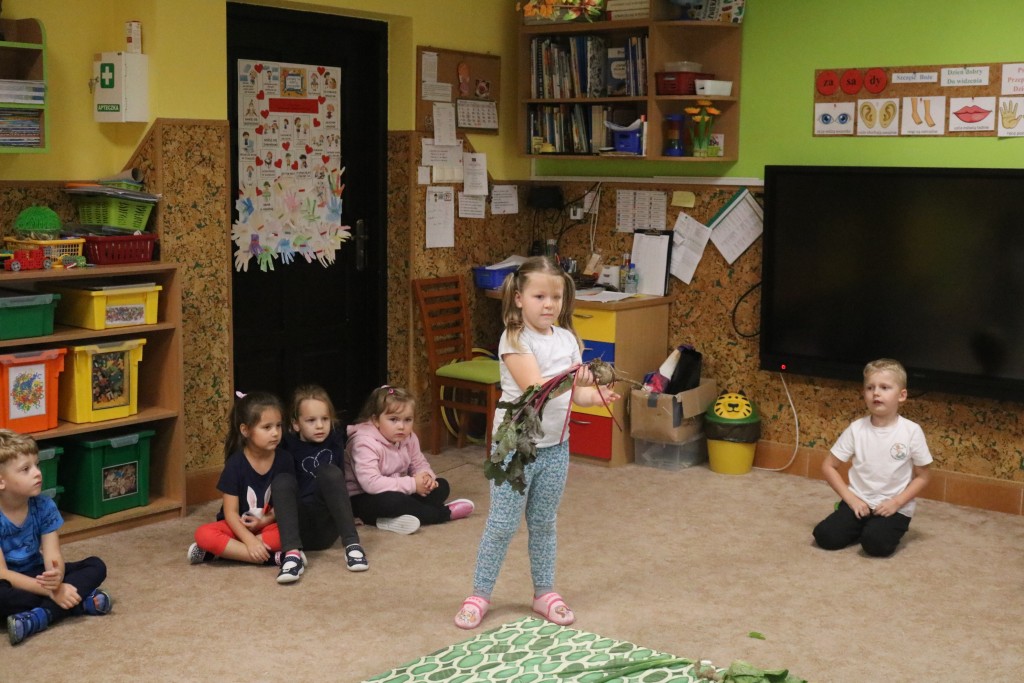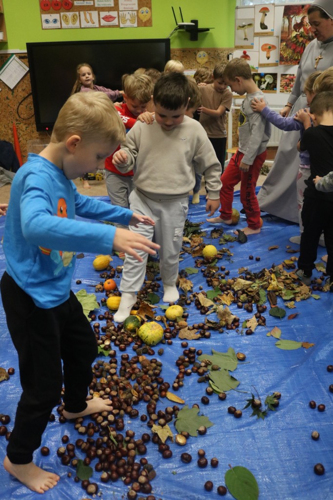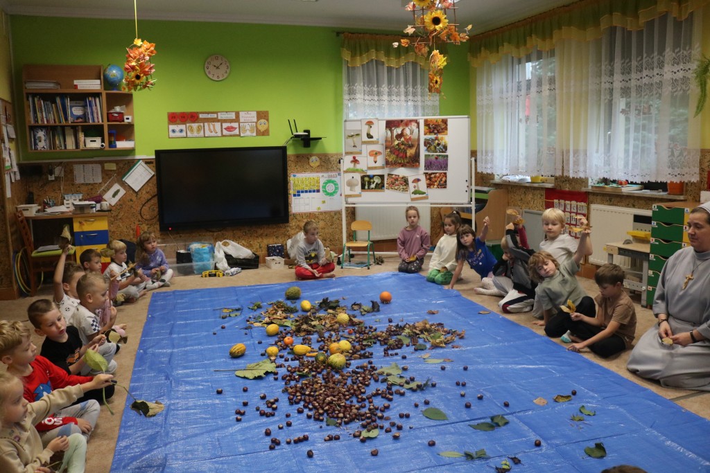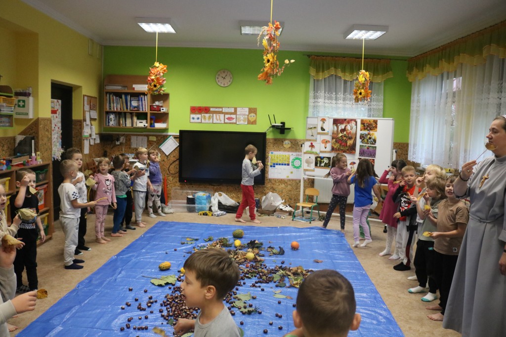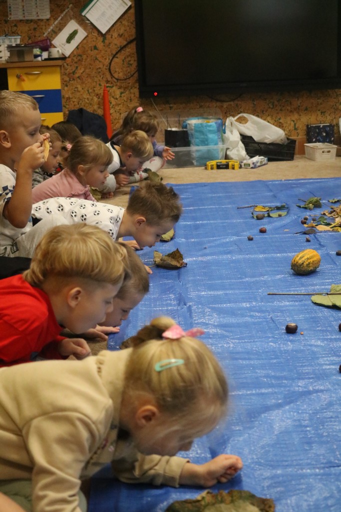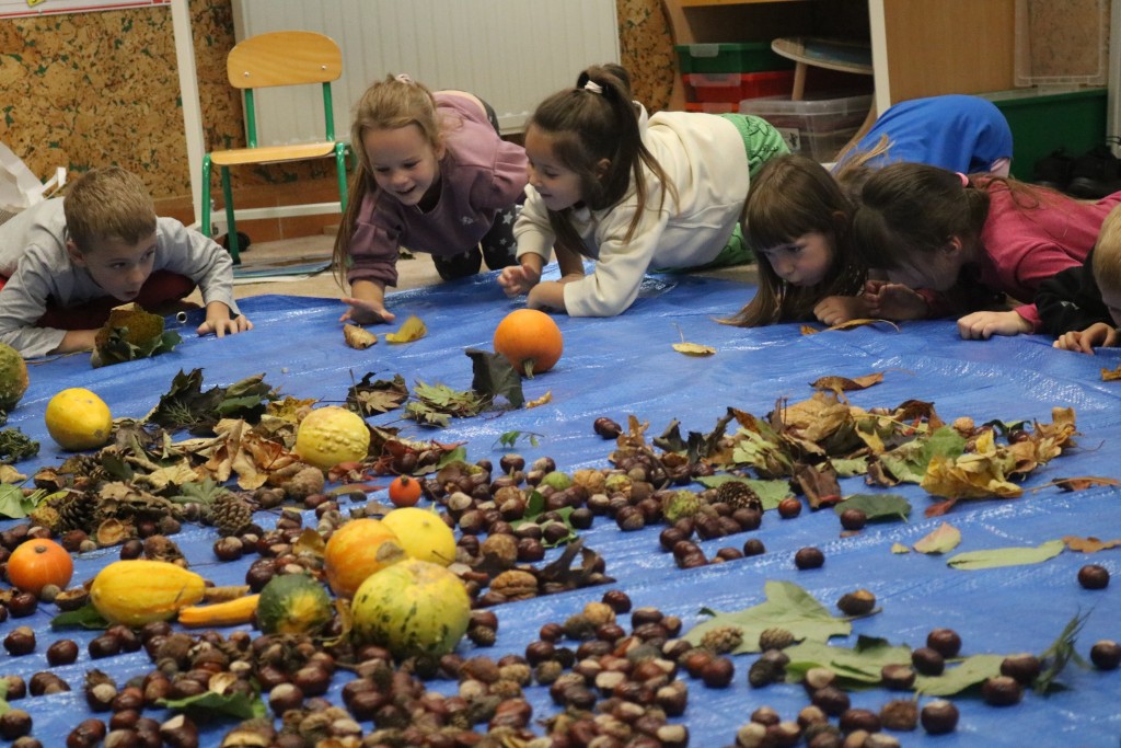 Nasze Przedszkolaki postanowiły udać się na spacer w celu poszukiwania oznak jesieni oraz zebrania jej darów w postaci liści i kasztanów.